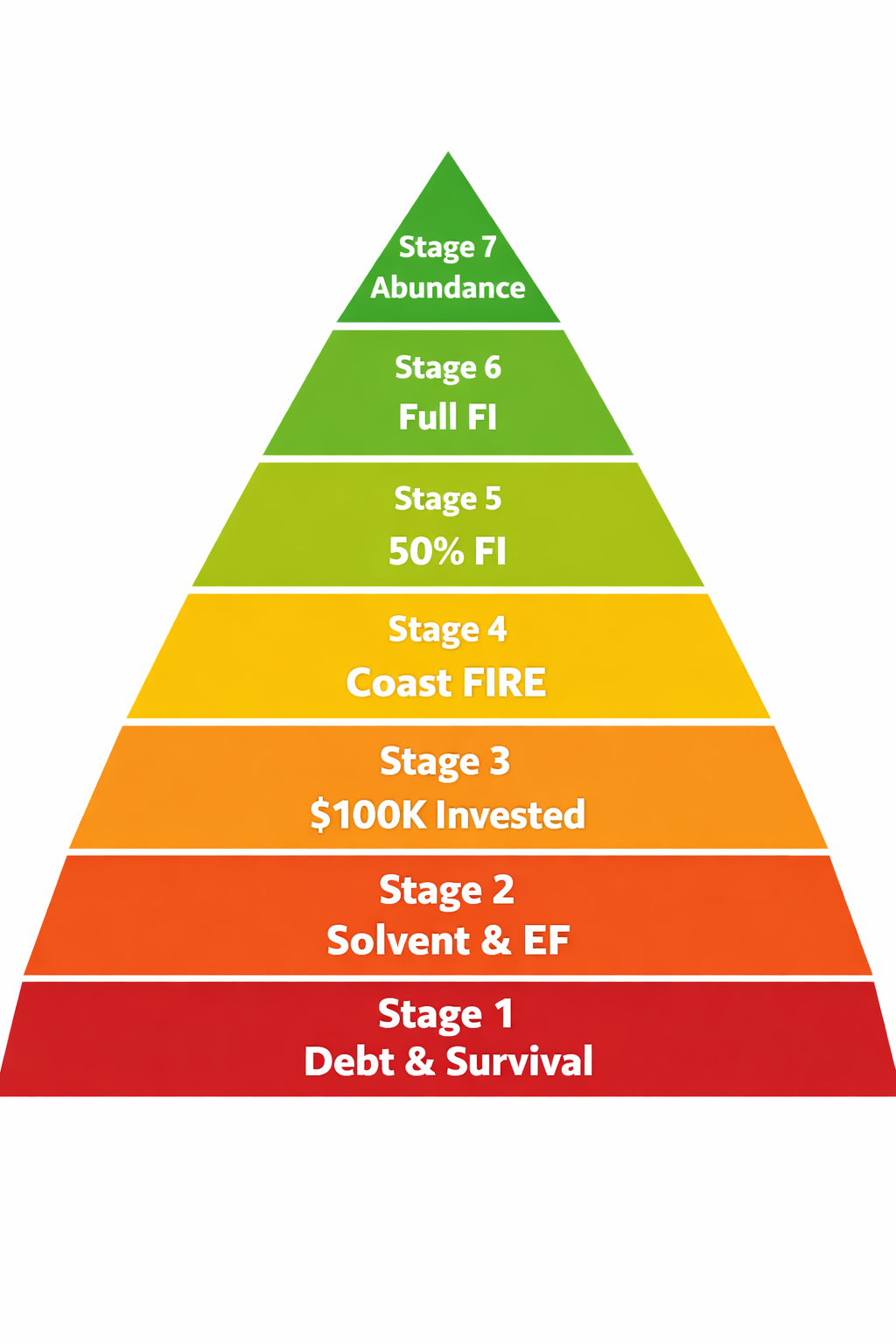 They move from debt and dependence to solvency, early investing, Coast FIRE, partial FI, full FI, and finally abundance. Each stage reflects both financial progress and increasing personal freedom, not just net worth alone.