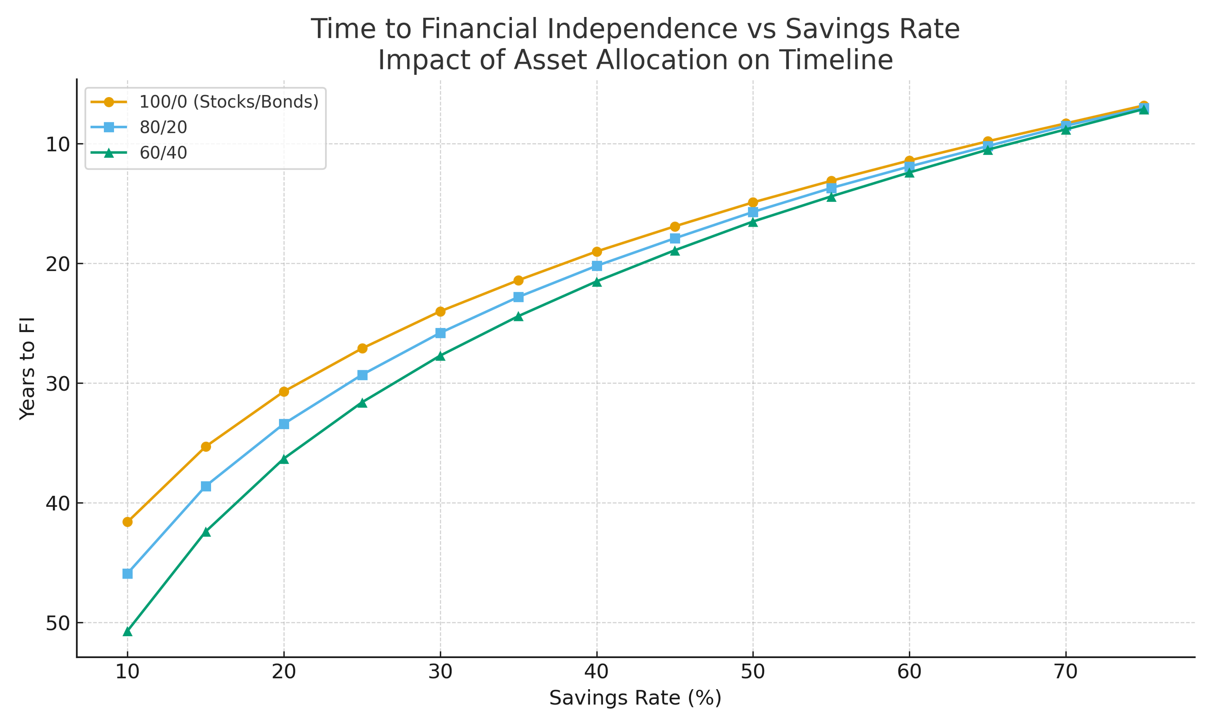 The resulting chart reveals a striking pattern. At low savings rates, the curves for different asset allocations diverge substantially. As we saw above, at a 10% savings rate, moving from a 60/40 portfolio to 100/0 reduces your working career by 9.1 years. Even moving to a 80/20 portfolio reduces your timeline to FI by 4.8 years.