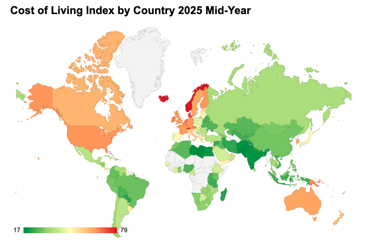 Figure 2: Cost-of-living index by country from Numbeo (2025).