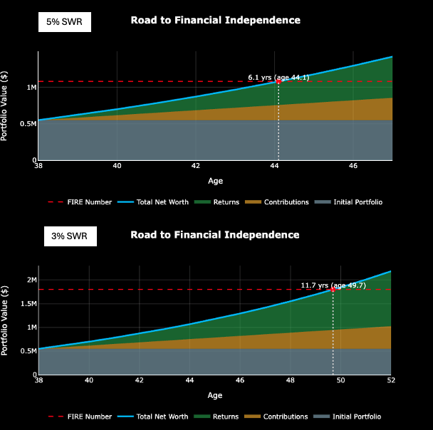Figure 1: Road to Financial Independence using a 5% vs 3% Safe Withdrawal Rate (SWR). Higher withdrawal rate targets can dramatically shorten your timeline to Financial Independence. Using our FI Calculator (free for email subscribers), a 5% SWR leads to FI in just over 6 years (age 44, Top chart), while a conservative 3% SWR stretches the journey to nearly 12 years (age 50, Bottom chart). For many, those extra six years represent thousands of working days—time that could be spent living a flexible, fulfilling early retirement instead.