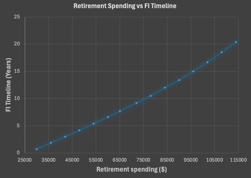 Figure 5. Retirement spending ($, x axis) vs Timeline to Financial Independence (years, y axis). The blue line depicts the relationship for the case study presented above (which had a 46% savings rate and a net worth of $650,000). If the household managed to rely on a 30% lower spending budget in retirement, they could retire 4 years earlier.