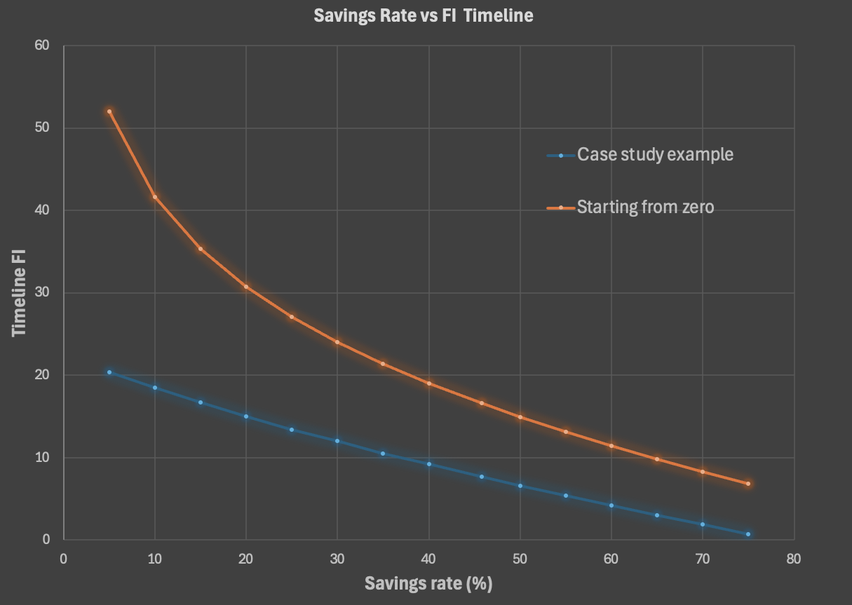 Figure 4. Savings rate (%, x axis) vs Timeline to Financial Independence (years, y axis). The blue line depicts the relationship for the case study presented above (which had a 46% savings rate). The orange line depicts the relationship for someone just starting out the FI journey (i.e., from 0 net worth).